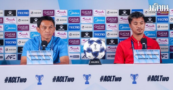 “โค้ชแบน” นายธชตวัน ศรีปาน หัวหน้าผู้ฝึกสอน “แข้งเทพ” ทรู แบงค็อก ยูไนเต็ด และ จักพัน ไพรสุวรรณ เข้าร่วมแถลงข่าวก่อนเกม เอเอฟซี แชมเปี้ยนส์ลีก ทู 2025/26 รอบแบ่งกลุ่มนัดที่สามของกลุ่มจี ทรู แบงค็อก ยูไนเต็ด เปิดบ้านพบ ไลอ้อน ซิตี้ เซเลอร์ส ตัวแทนจากประเทศสิงคโปร์ ที่ห้องแถลงข่าวสนาม ทรู บีจี สเตเดียม เมื่อวันที่ 22 ตุลาคม