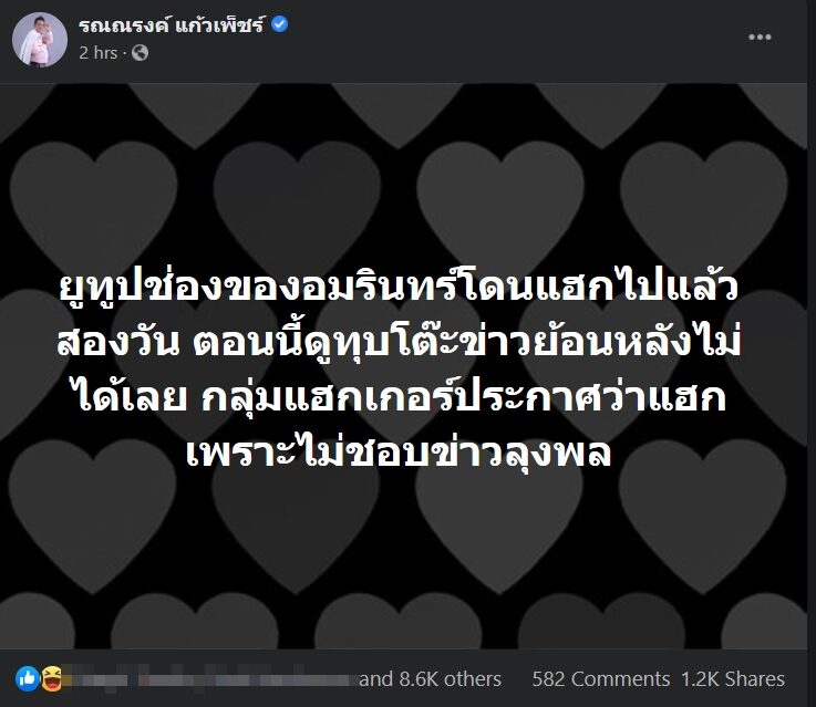 ขณะที่ ทนายชื่อดัง รณรงค์ แก้วเพ็ชร์ ได้ออกมาโพสต์เฟซบุ๊ก ระบุว่า “ยูทูปช่องของอมรินทร์โดนแฮกไปแล้วสองวัน ตอนนี้ดูทุบโต๊ะข่าวย้อนหลังไม่ได้เลย กลุ่มแฮกเกอร์ประกาศว่าแฮกเพราะไม่ชอบข่าวลุงพล”