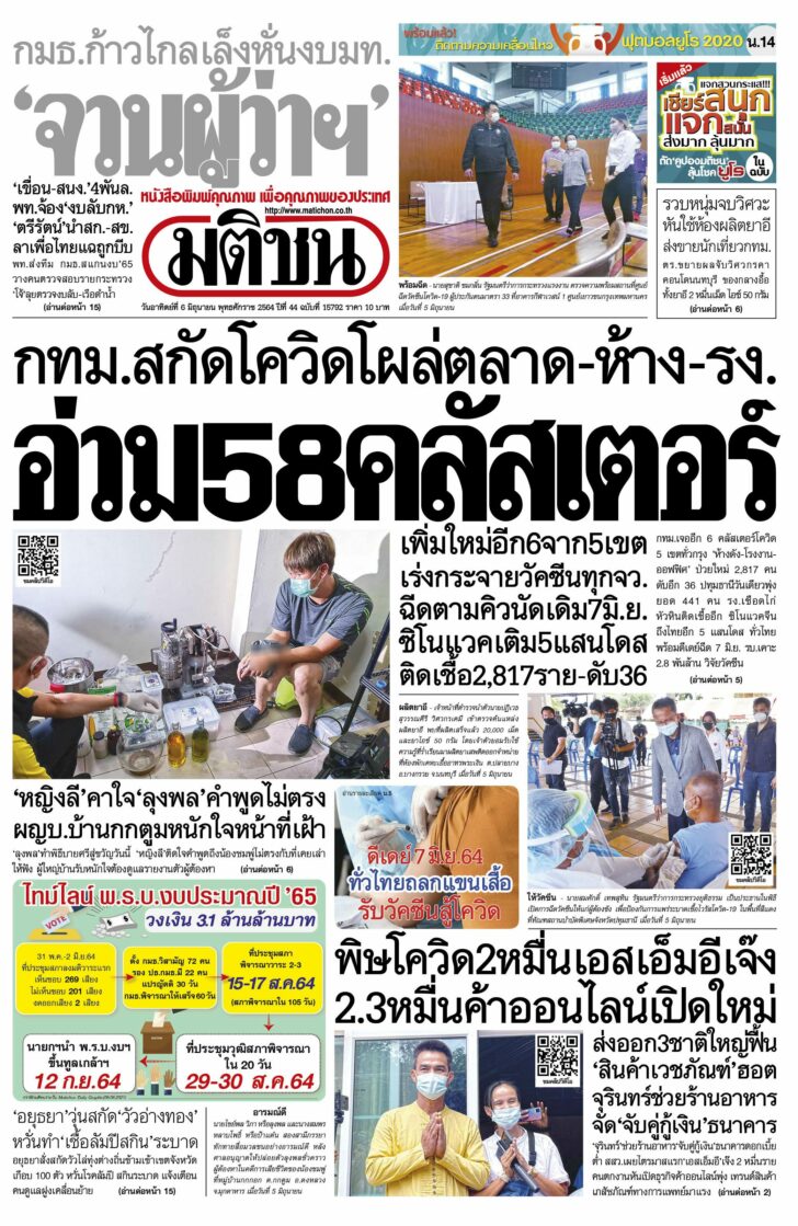 หน้า 1 หนังสือพิมพ์ หน้า 1 หนังสือพิมพ์มติชนรายวัน ฉบับวันอาทิตย์ ที่ 6 มิถุนายน พ.ศ.2564 วันที่ 6 มิถุนายน 2564 - 07:05 น. FacebookTwitterLINECopy Link เกาะติดทุกสถานการณ์จาก Line @Matichon ได้ที่นี่ บทความก่อนหน้านี้ปืนยาวสาวมือดีของไทย ‘ธัญลักษณ์’ ผ่าตัดเข่า – ลั่นคว้าทองซีเกมส์ปลายปีบทความถัดไปสกู๊ปหน้า 1 : ดีเดย์ 7 มิ.ย.64 ทั่วไทยถลกแขนเสื้อ รับวัคซีนสู้โควิด