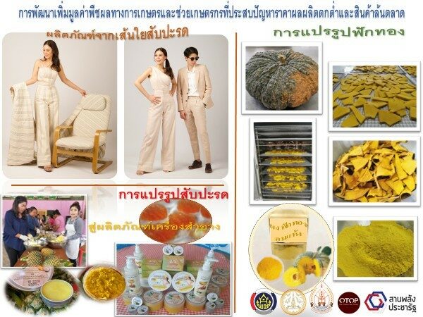 นอกจากนี้ ยังได้รับความร่วมมือจากทีมอาจารย์ที่ปรึกษาจากมหาวิทยาลัยนครพนม ซึ่งเป็นผู้เชี่ยวชาญ มีประสบการณ์การทำงานด้านการออกแบบและพัฒนาผลิตภัณฑ์ประเภทอาหาร ประเภทสมุนไพรที่ไม่ใช่อาหาร ประเภทของใช้ของที่ระลึกและของตกแต่ง ประเภทผ้าและเครื่องแต่งกาย รวมจำนวน 7 คน มาเป็นที่ปรึกษาให้คำแนะนำ วิเคราะห์และแก้ไขปัญหาต่างๆ ในการพัฒนาผลิตภัณฑ์ และการต่อยอดพัฒนาผลิตภัณฑ์โดยใช้เทคโนโลยีและนวัตกรรม ให้ได้ตามเกณฑ์แนวทางพัฒนาผลิตภัณฑ์ OTOP โดยเครือข่ายองค์ความรู้ KBO ในเรื่องการรับรองมาตรฐาน ผลิตภัณฑ์และบรรจุภัณฑ์มีคุณภาพ สามารถผลิตซ้ำได้ในปริมาณและคุณภาพใกล้เคียงกัน มีเอกลักษณ์ที่โดดเด่นเฉพาะตัวนำเสนอเรื่องราวที่สร้างสรรค์น่าสนใจ มีตลาดจำหน่ายที่ถาวร และมีแบรนด์สินค้าที่สามารถนำไปใช้ในการส่งเสริมการตลาด พร้อมทั้งการพัฒนาเส้นใยสับปะรดซึ่งเป็นพืช GI ของจังหวัดนครพนม มาใช้ในการทอผ้าโดยนำเศษเหลือทิ้งทางการเกษตรมาสร้างให้เกิดมูลค่าเพิ่มจาก “ใบของต้นสับปะรด” มาทำเป็นเส้นใยที่มาจากธรรมชาติมาผสมผสานกับเส้นใยฝ้ายที่ชุมชนใช้อยู่ในปัจจุบันผ่านกระบวนการย้อมทอแบบธรรมชาติโดยเน้นใช้สีย้อมจากไม้มงคล โดยทุกขั้นตอนใช้กระบวนการที่เป็นมิตรกับสิ่งแวดล้อม และการแปรรูปสับปะรดเป็นเกลือสปาและสบู่สับปะรด รวมถึงการแปรรูปฟักทองเป็นฟักทองผงอบแห้ง ฟักทองเชื่อมอบแห้ง เป็นการพัฒนาเพิ่มมูลค่าพืชผลทางการเกษตรและช่วยเกษตรกรที่ประสบปัญหาราคาผลผลิตตกต่ำและสินค้าล้นตลาด