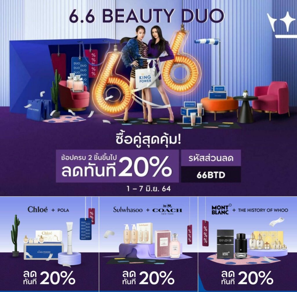 แคมเปญแรก “6.6 Beauty Duo -ช้อปเป็นคู่รับส่วนลด 20%” ในวันที่ 6 เดือน 6 หรือ วันที่ 6 มิถุนายน 2564 เลือกช้อปแบรนด์อินเตอร์ดัง ซื้อคู่สุดคุ้ม เพียงจับคู่กันครบ 2 ชิ้นขึ้นไป ลดทันที 20% ระหว่างวันที่ 1 – 7 มิถุนายน 2564 ห้ามพลาด!! ไฮไลต์วันที่ 6 มิถุนายน 2564