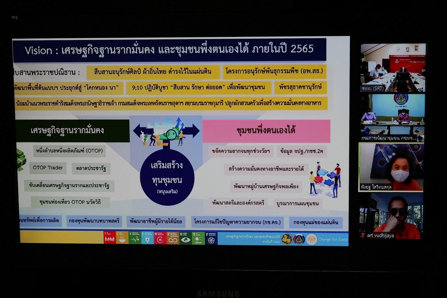 กรมการพัฒนาชุมชน น้อมนำหลักปรัชญาของเศรษฐกิจพอเพียง และทฤษฎีใหม่ เป็นหัวใจหลักเชื่อมโยงในทุกภารกิจ เพื่อบรรลุเป้าหมายการพัฒนาที่ยั่งยืน (Sustainable Development Goals หรือ SDGs) ขององค์การสหประชาชาติ (UN) และสนองนโยบายสำคัญของรัฐบาล ในการแก้ไขปัญหาความยากจนและยกระดับคุณภาพชีวิตของประชาชนชาวไทยให้อยู่ดีมีสุขอย่างยั่งยืน บนพื้นฐานของความสมดุลพอดี และความพอประมาณอย่างมีเหตุผล ภายใต้ปรัชญาของเศรษฐกิจพอเพียง ด้วยเชื่อมั่นว่า ปัญหาความยากจนเป็นเรื่องที่สามารถร่วมกันแก้ไขได้ โดยอาศัยการบูรณาการการทำงาน ร่วมกับทั้ง 7 ภาคีเครือข่าย ดึงศักยภาพจุดแข็งของแต่ละหน่วยงานมาใช้ให้เกิดประโยชน์สูงสุด เพื่อขจัดปัญหาความเดือดร้อนที่ยืดเยื้อยาวนาน อาทิ ปัญหาหนี้สิน ทั้งในระบบและนอกระบบ ปัญหาเกี่ยวกับการจัดสรรทรัพยากรธรรมชาติที่ทำกิน ปัญหาน้ำท่วมน้ำแล้ง ปัญหาที่อยู่อาศัย ปัญหาเกี่ยวกับอาชีพ และการมีงานทำ เป็นต้น กลไกหลักคือการพัฒนาที่เริ่มจากตัวคน สร้างความเข้มแข็งจากภายใน ไปสู่ความเจริญก้าวหน้าในมิติสังคม เศรษฐกิจ สิ่งแวดล้อม และประเทศชาติต่อไป