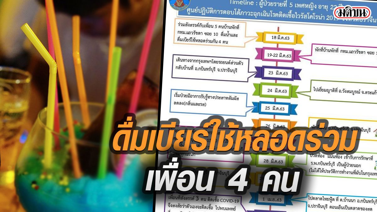 สำหรับไทม์ไลน์ของผู้ป่วยรายที่ 5 เป็นเพศหญิง อายุ 22 ปี ทำงานในผับแห่งหนึ่งที่กรุงเทพฯ โดยเมื่อวันที่ 18 มี.ค.ที่ผ่านมา ได้ร่วมสังสรรค์กับเพื่อน 5 คน ในบ้านพักที่ กทม. ย่านรัชดา ซอย 10 โดยดื่มน้ำและเบียร์ใช้หลอด ร่วมกัน 4 คน ระหว่างวันที่ 19-22 มี.ค. พักที่บ้านพักที่ กทม. ย่านรัชดา ซอย 10