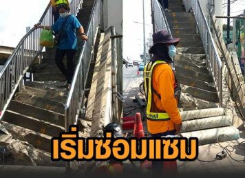 เริ่มซ่อมแล้ว สะพานลอยตลาดดีแสมดำ หลังโดนรถชน เสียหายหนัก โซเชียลวิจารณ์สนั่น