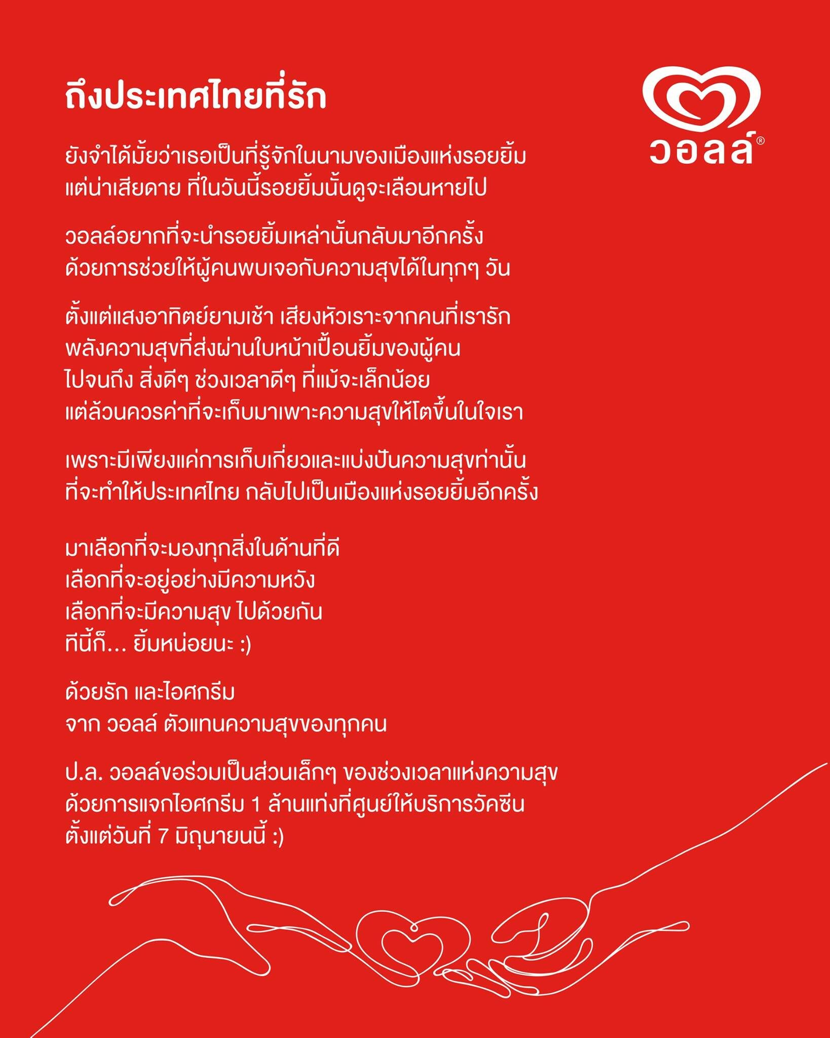 โดยระบุว่า “เพราะรอยยิ้มจากความสุขของทุกคนคือสิ่งสำคัญ! วอลล์ขอร่วมเป็นส่วนหนึ่งของช่วงเวลาแห่งความสุขด้วยการแจกไอศกรีม 1 ล้านแท่ง เติมเต็มรอยยิ้มของคุณ ตั้งแต่วันที่ 7 มิถุนายนนี้ ที่ศูนย์ให้บริการวัคซีน”